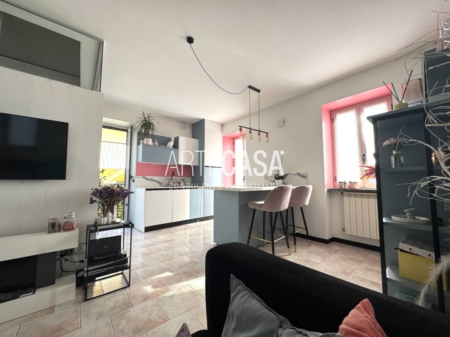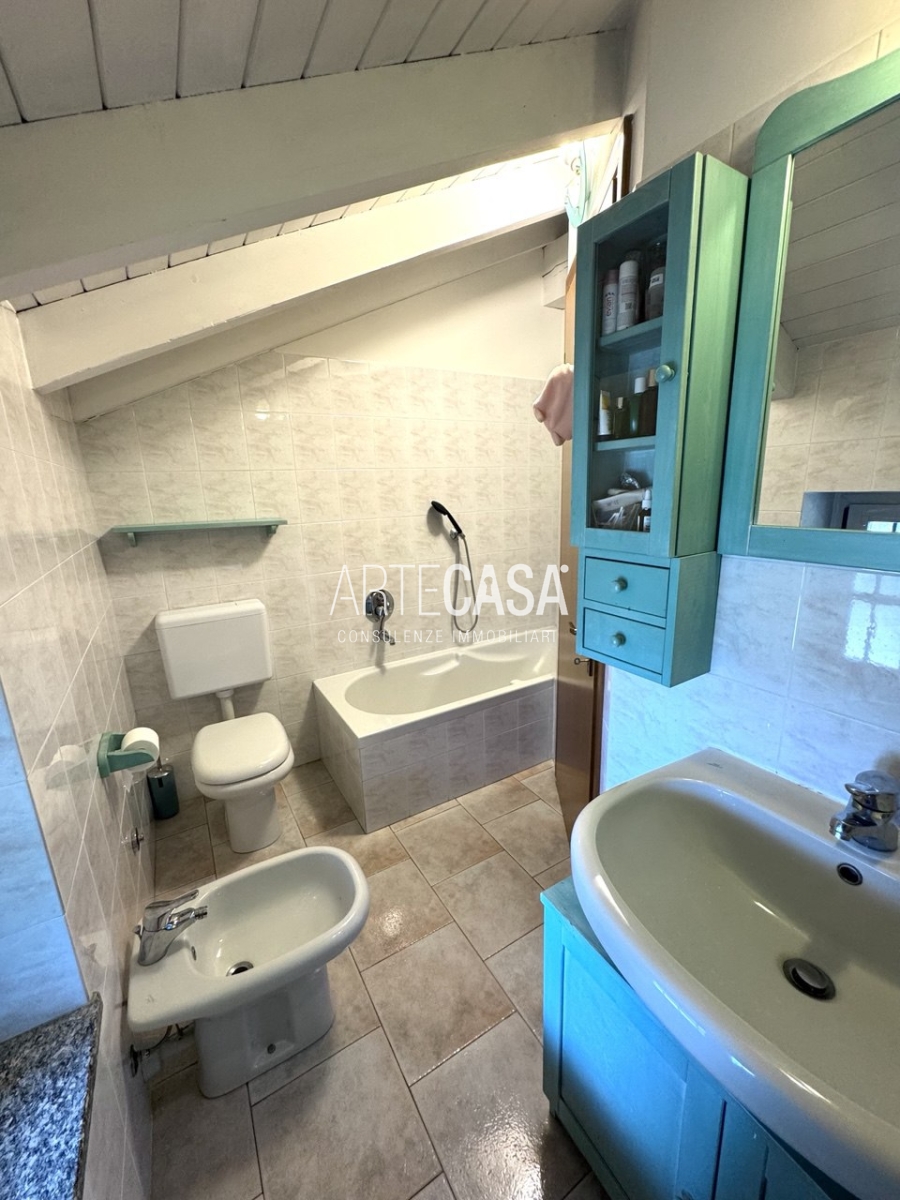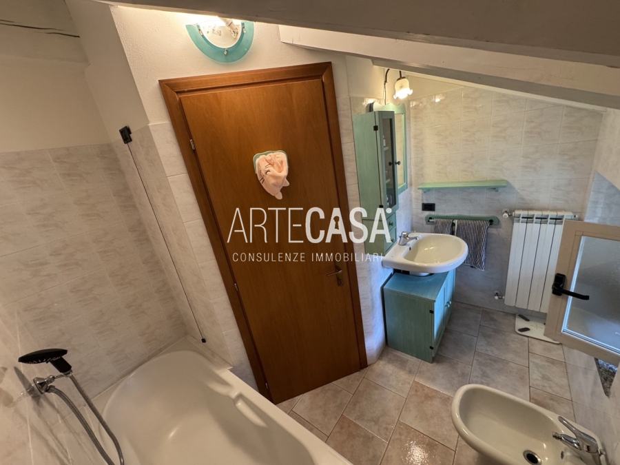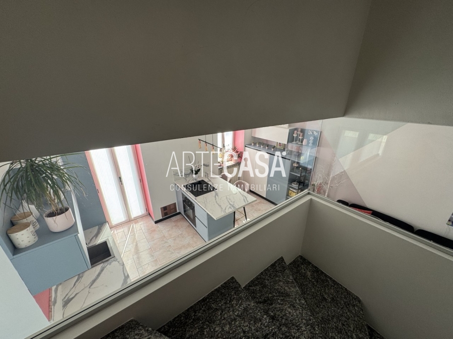 Ingresso sul soggiorno con cucina a vista e sfogo sui due balconi. Al piano è presente un bagno dotato di piatto doccia e attacco per la lavatrice. La scala rifinita in vetro con vista sulla zona giorno conduce al piano mansardato rifinito con travi in legno a vista. Il disimpegno con velux ospita una comoda armadiatura e la zona notte ospita la camera matrimoniale, la cameretta e il secondo bagno con vasca.