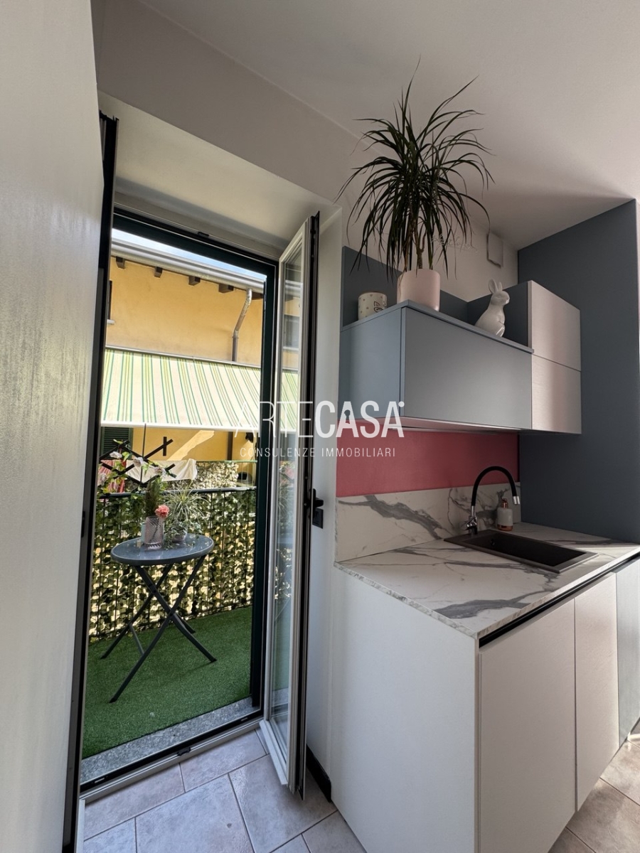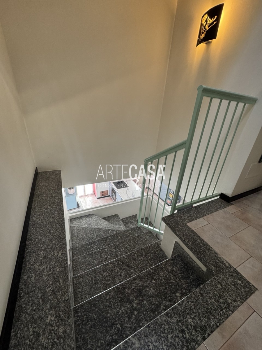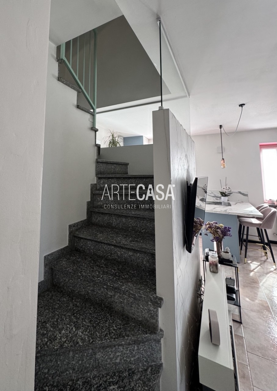 Ingresso sul soggiorno con cucina a vista e sfogo sui due balconi. Al piano è presente un bagno dotato di piatto doccia e attacco per la lavatrice. La scala rifinita in vetro con vista sulla zona giorno conduce al piano mansardato rifinito con travi in legno a vista. Il disimpegno con velux ospita una comoda armadiatura e la zona notte ospita la camera matrimoniale, la cameretta e il secondo bagno con vasca.