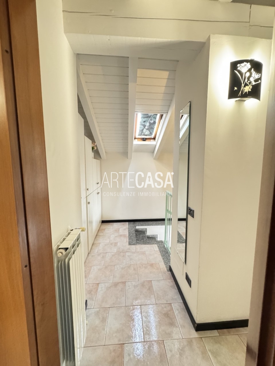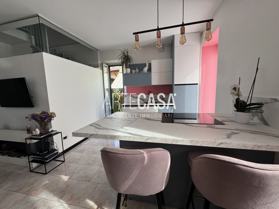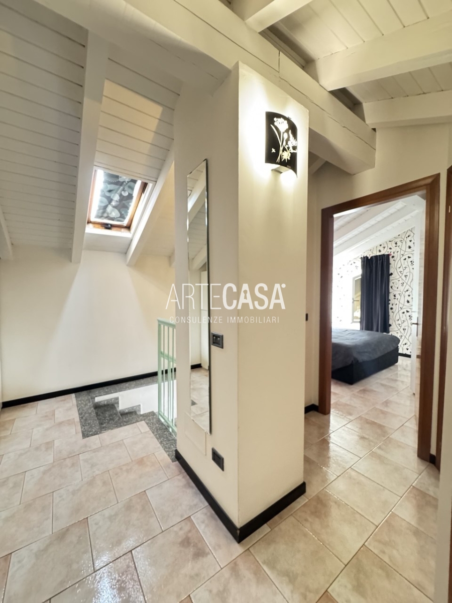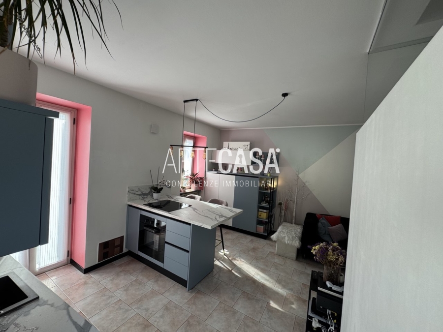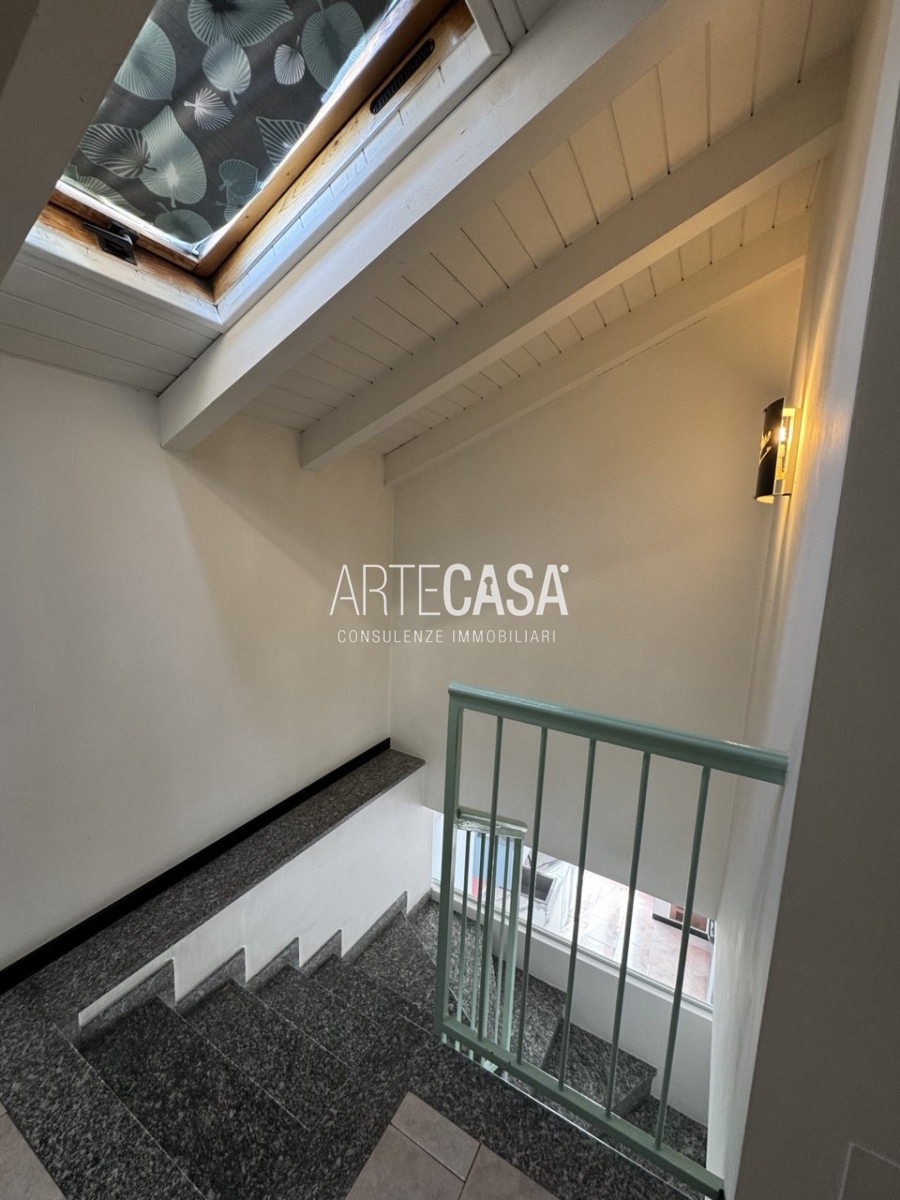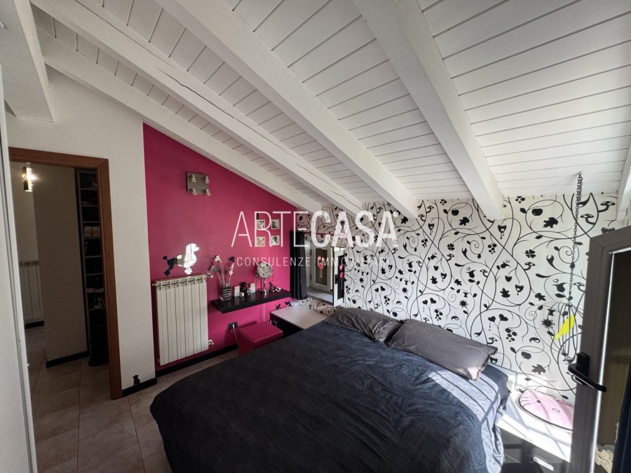 Ingresso sul soggiorno con cucina a vista e sfogo sui due balconi. Al piano è presente un bagno dotato di piatto doccia e attacco per la lavatrice. La scala rifinita in vetro con vista sulla zona giorno conduce al piano mansardato rifinito con travi in legno a vista. Il disimpegno con velux ospita una comoda armadiatura e la zona notte ospita la camera matrimoniale, la cameretta e il secondo bagno con vasca.