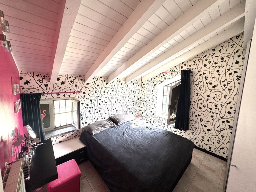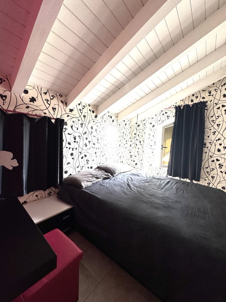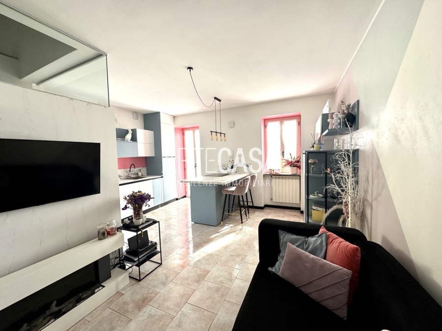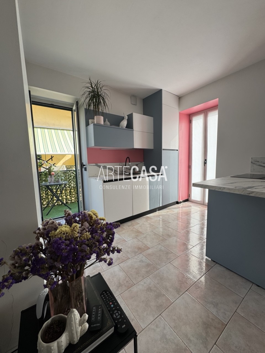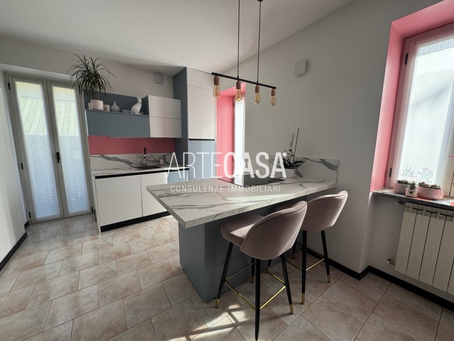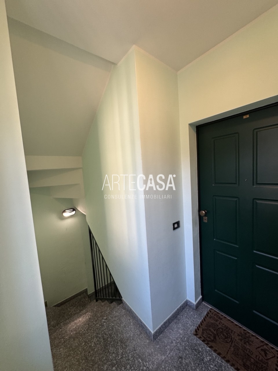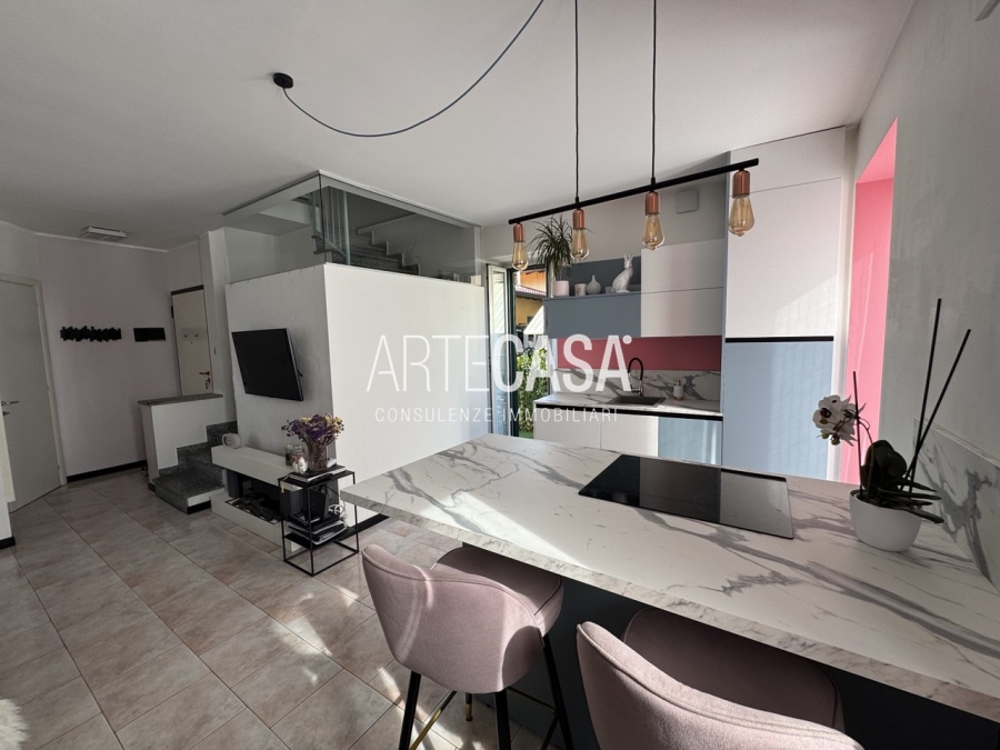 Ingresso sul soggiorno con cucina a vista e sfogo sui due balconi. Al piano è presente un bagno dotato di piatto doccia e attacco per la lavatrice. La scala rifinita in vetro con vista sulla zona giorno conduce al piano mansardato rifinito con travi in legno a vista. Il disimpegno con velux ospita una comoda armadiatura e la zona notte ospita la camera matrimoniale, la cameretta e il secondo bagno con vasca.